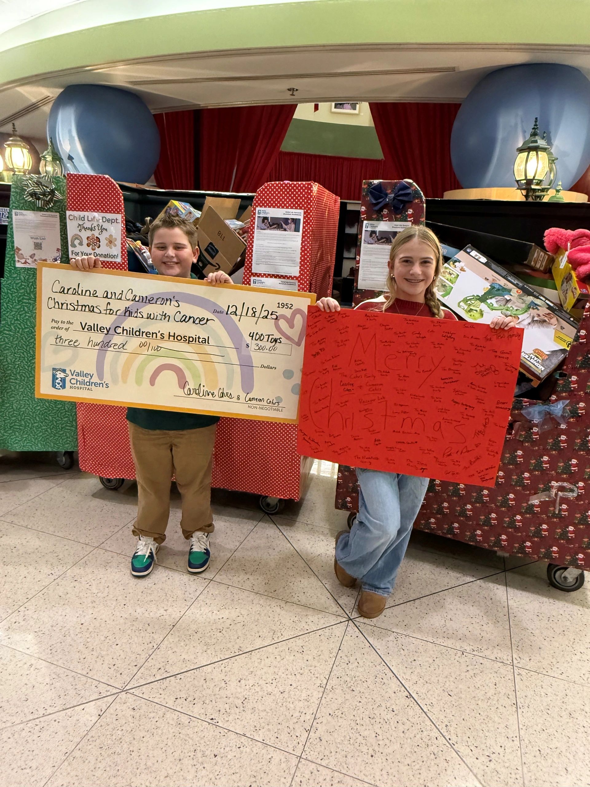 Hi there, this is Caroline and Cam Cohrs and we are holding the 3rd annual "Caroline and Cam's Christmas For Kids With Cancer" to benefit the kids at Valley Children's Hospital in both the Oncology Clinic and the inpatient oncology unit (Craycroft). This toy drive/fundraiser started in 2022 when our Daddy, Brandon Cohrs, was diagnosed with kidney cancer at age 41 and became a cancer survivor after having his kidney successfully removed. Thankfully, he is doing great and is considered cured. We are so thankful, we wanted to do something special during the holiday season for kids with cancer, so we started this philanthropy. Since our Mommy, April Cohrs, works at Valley Children's Hospital we thought it would be great to help those kids and spread joy this and every holiday season. In the last 2 years, we have collected over 575 toys and raised $875! I know we can beat that this year. Like last year, we have partnered with Caroline's dance studio, Dolce Dance Studio, as a mailing/drop-off location. Please join us and donate to our cause.